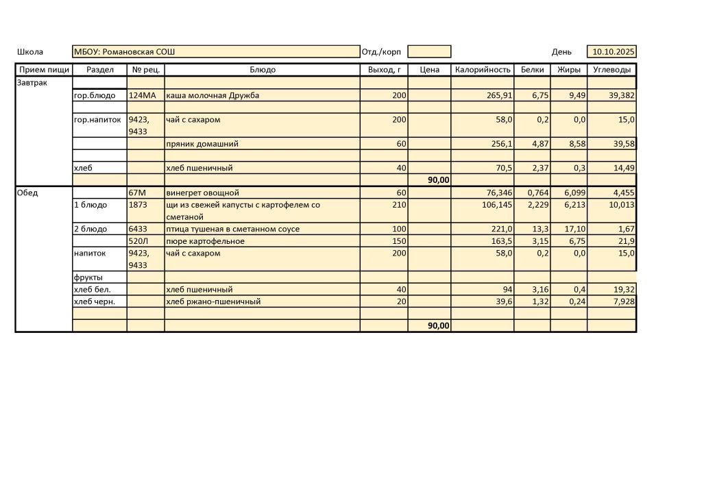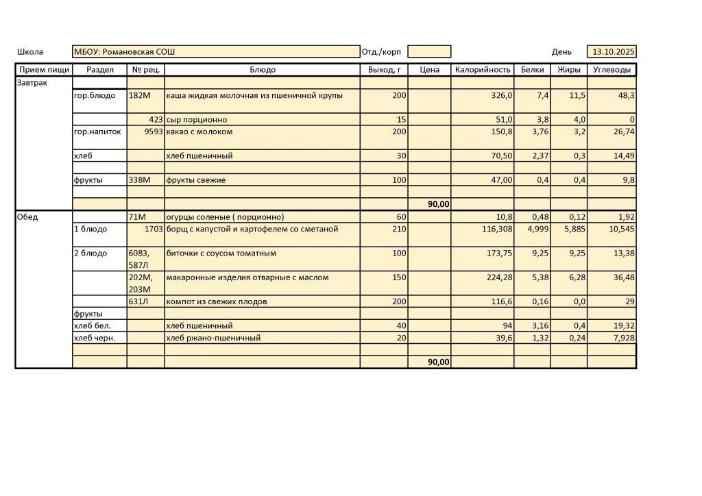 Перспективное 10-ти дневноле меню для обучающихся из малоимущих семей