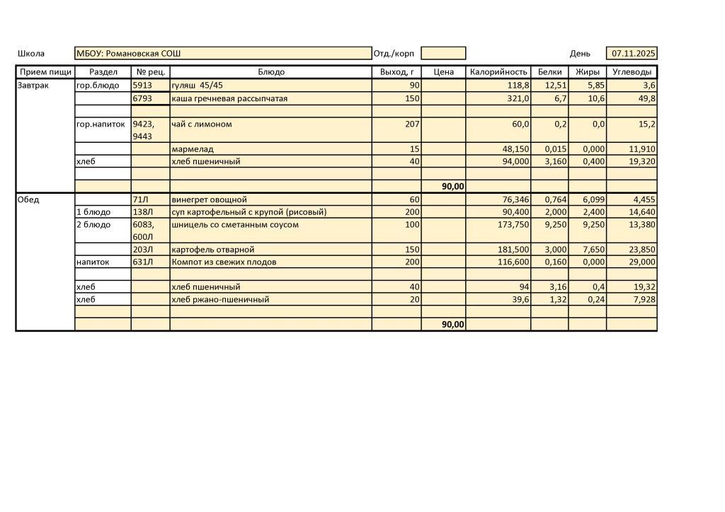 Ежедневное меню горячего питания для начальных классов