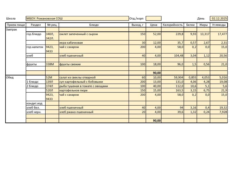 Цикличное двухнедельное меню для обучающихся 1-4 классов (завтрак) на 2025-2026 учебный год